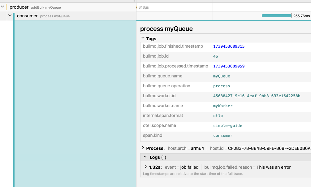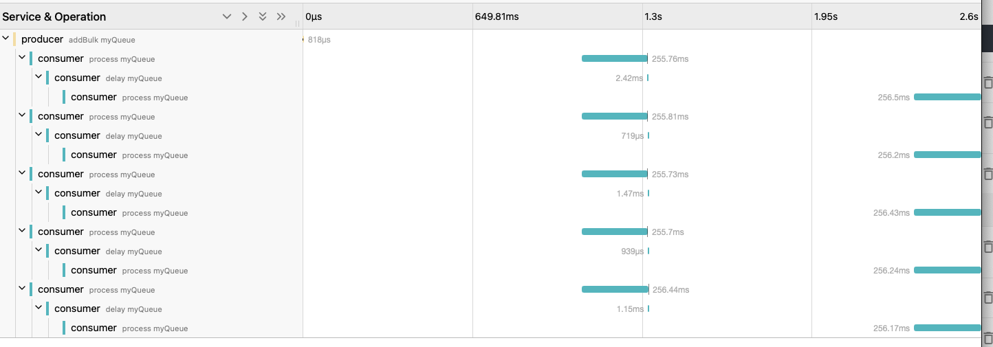 또한 작업이 1번 실패하도록 강제했기 때문에, 짧은 backoff (delay) 후 재시도됩니다. 그래서 “delay myQueue” span이 보이고, 그다음 최종 “process myQueue” span이 보입니다.