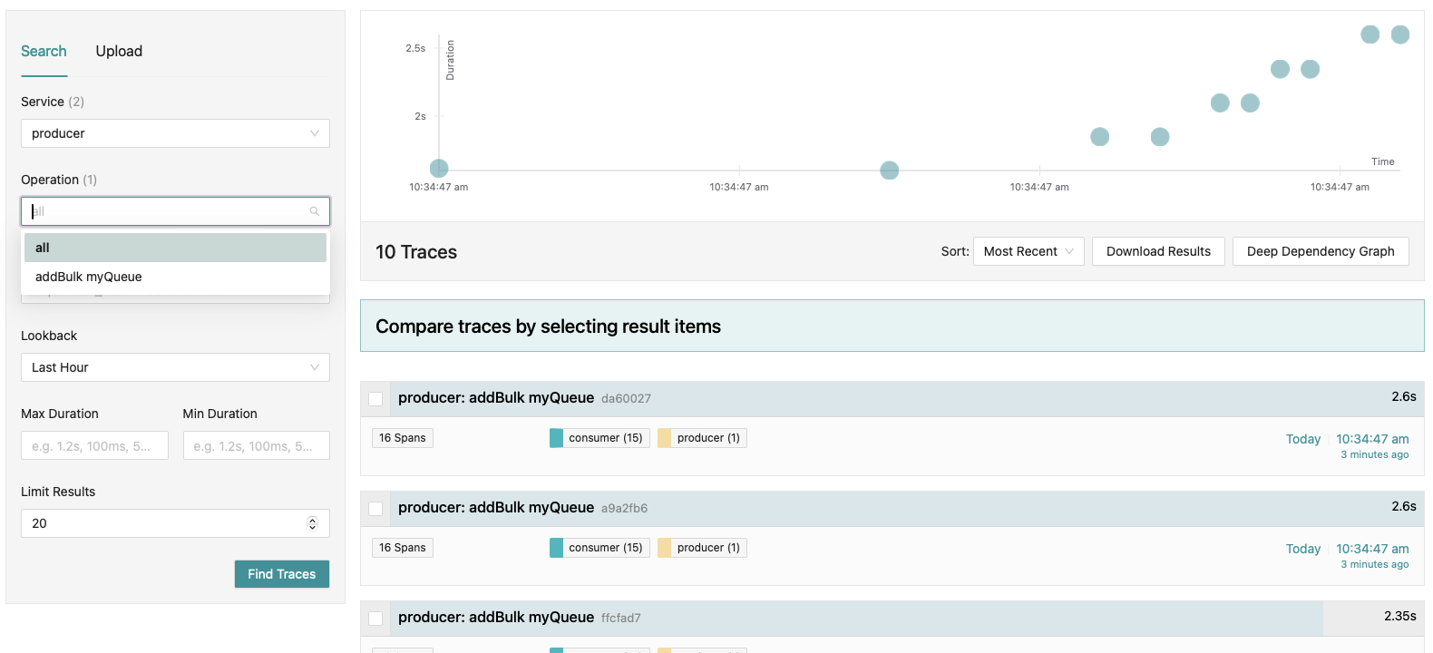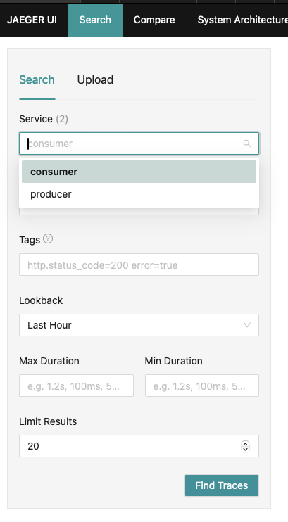 이제 선택 가능한 서비스가 2개(consumer, producer) 생겼습니다. producer에서 trace를 검색하면 producer가 관여한 모든 trace를 볼 수 있습니다: